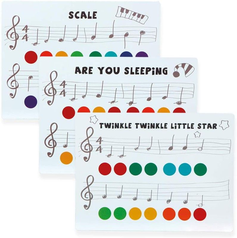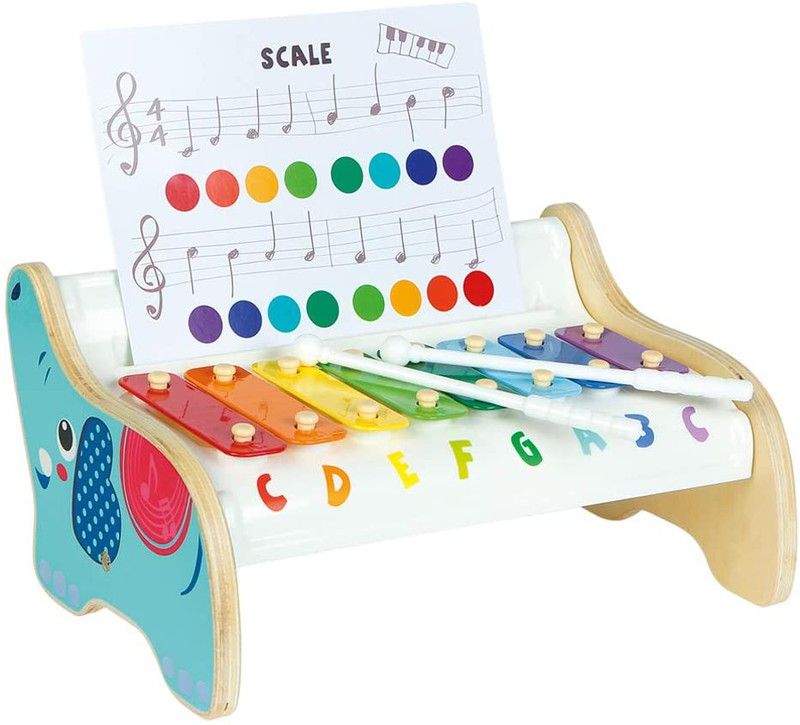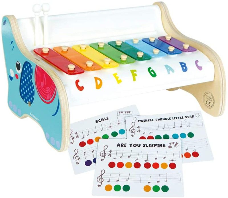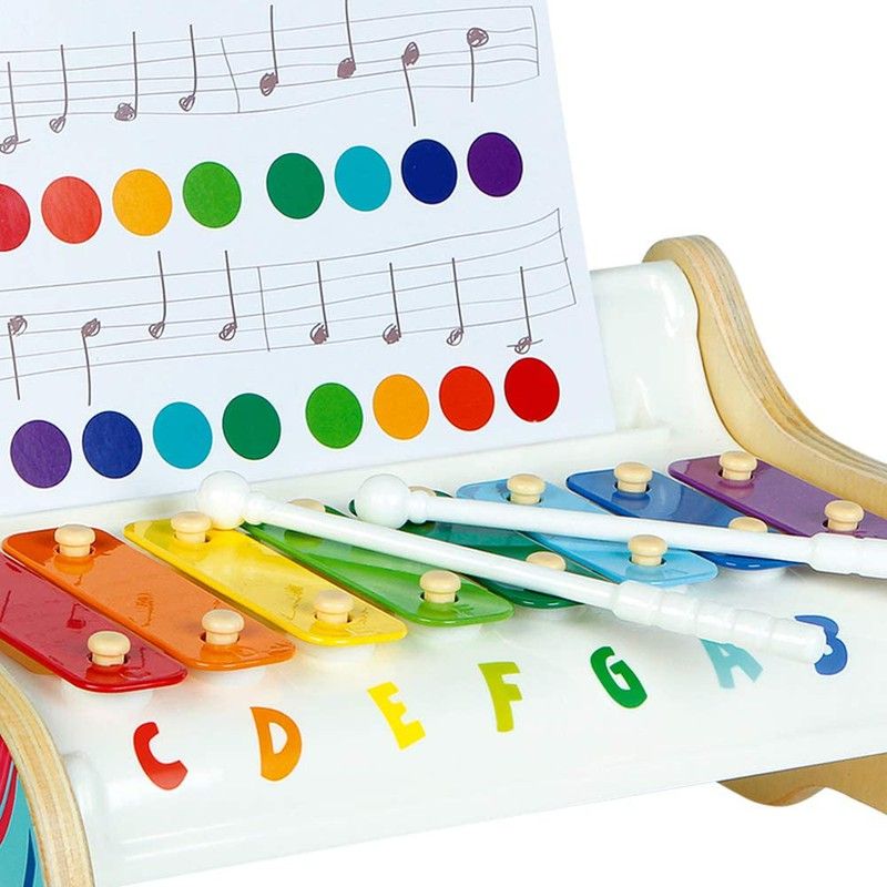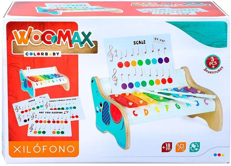 Xilófono de madera con partituras, Fabricado en madera natural de gran calidad con partes de plástico resistente, Medidas 28,5 cm x 19 cm x 13,5 cm, Están incluidas 2 baquetas y 3 partituras con diferentes melodías insertables en el soporte para que puedan ser interpretadas fácilmente, El Xilófono tiene notas pintadas en diferentes colores para facilitar el aprendizaje
